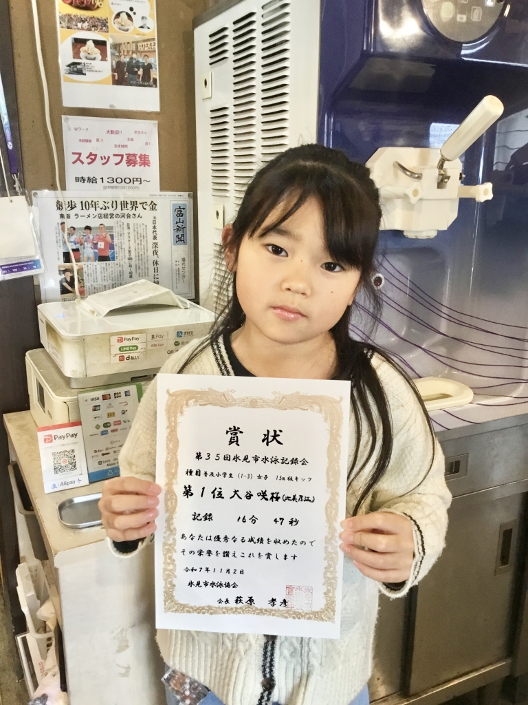 《アミューフィットネスクラブ バタ足大会》 年長女子の部 1位🥇 『且見 光希』ちゃん 2年女子の部 3位🥉 『上田 里紗』ちゃん
